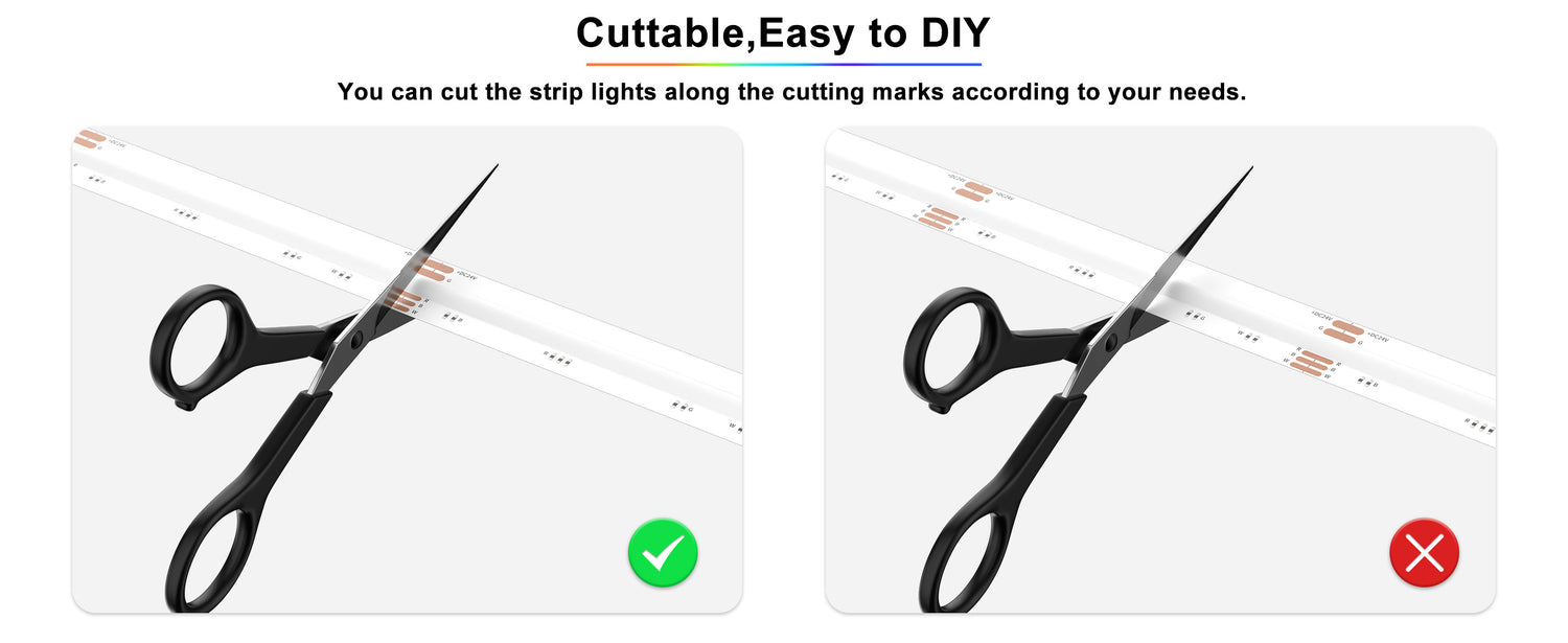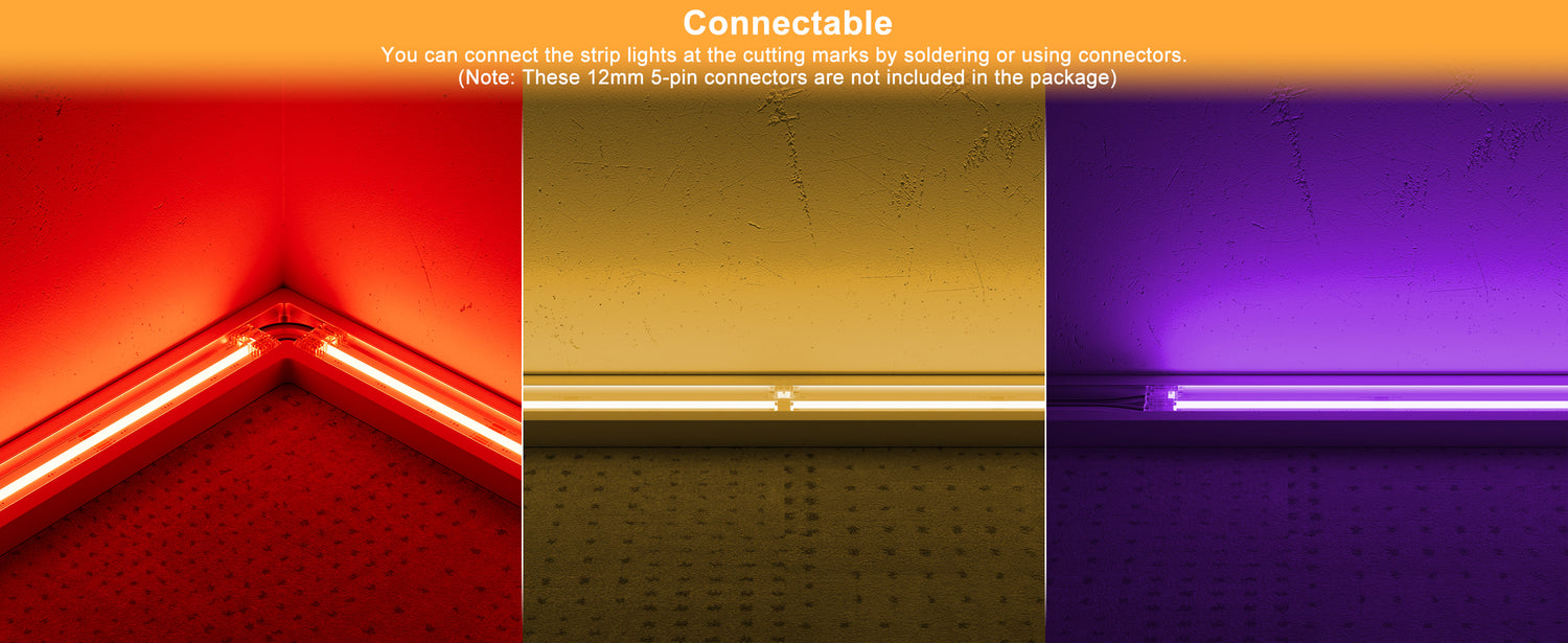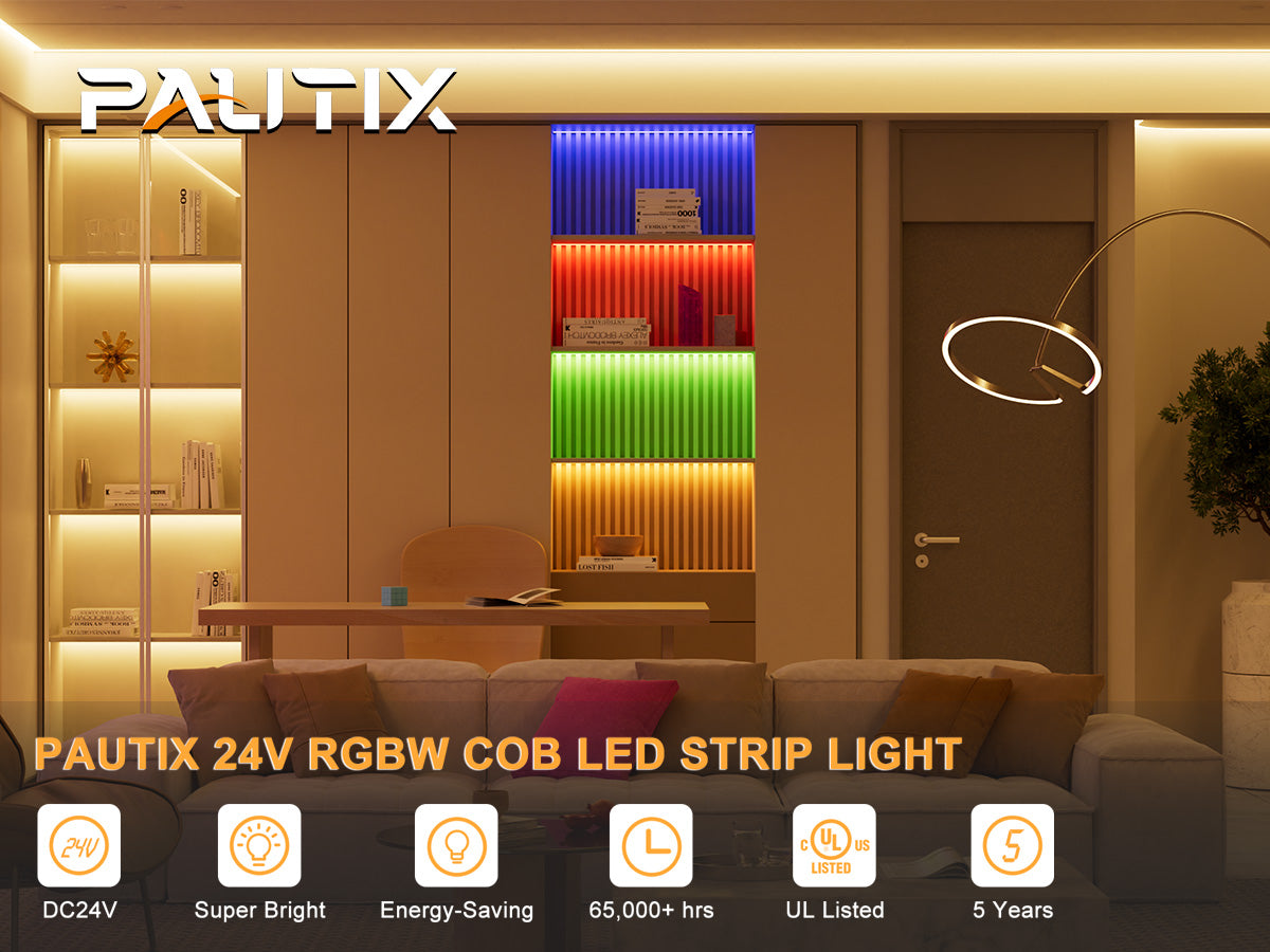 • Flexible,Easy to DIY: PAUTIX 24V RGBW COB LED strip light designed in 12mm width & 5 electrical lines is very flexible. The strip light can be cut or reconnected every 62mm/2.44in along the cutting point. You can connect the strips by soldering or using connectors(Search for "B0CQY8PCF4" to find a compatible 12mm connector kit).