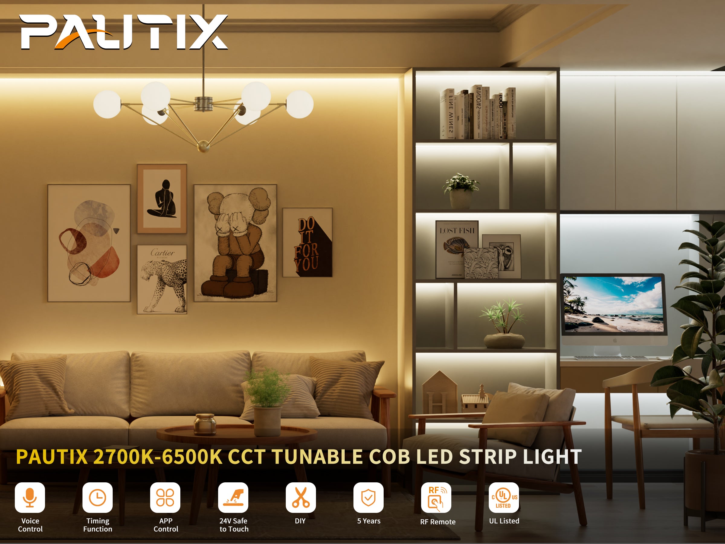 - 【Tunable White COB LED Strip Light】Dimmable white light from warm white to cool white (2700K-6500K),whether you are relaxing or working,one light to meet all your needs! With 6400LEDs,PAUTIX Tunable COB led strip light creates super bright and even lighting performance.Anti slip buckle design, connection is not easy to loose