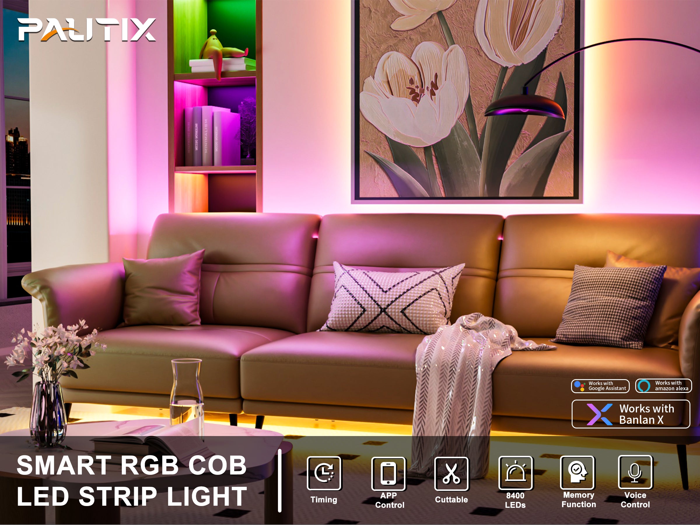 - 【Safe & Long Lifespan】PAUTIX RGB COB LED strip light is UL-LISTED which is safer for daily use.High-quality LED chips on PCB board to keep the mixed colors more vivid and brighter.The real double-layer PCB material makes the light strip have excellent conductivity and heat dissipation and is not easy to crack. The PCB material is very high-quality and robust, with a service life of more than 65,000 hours!