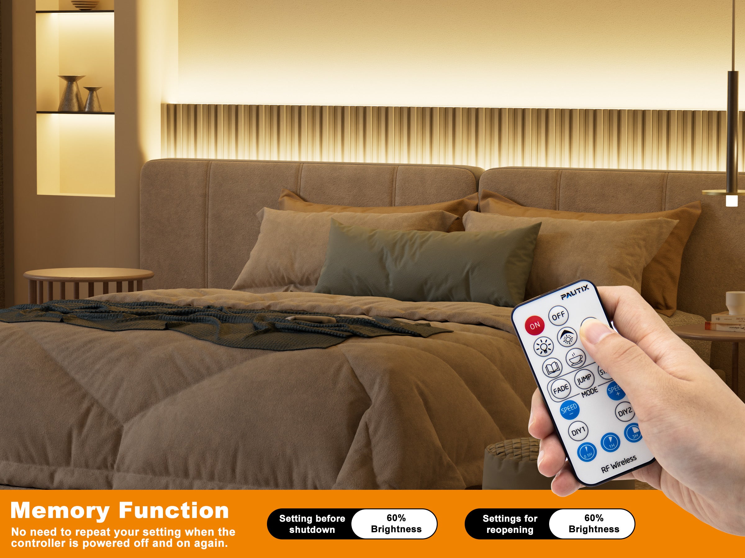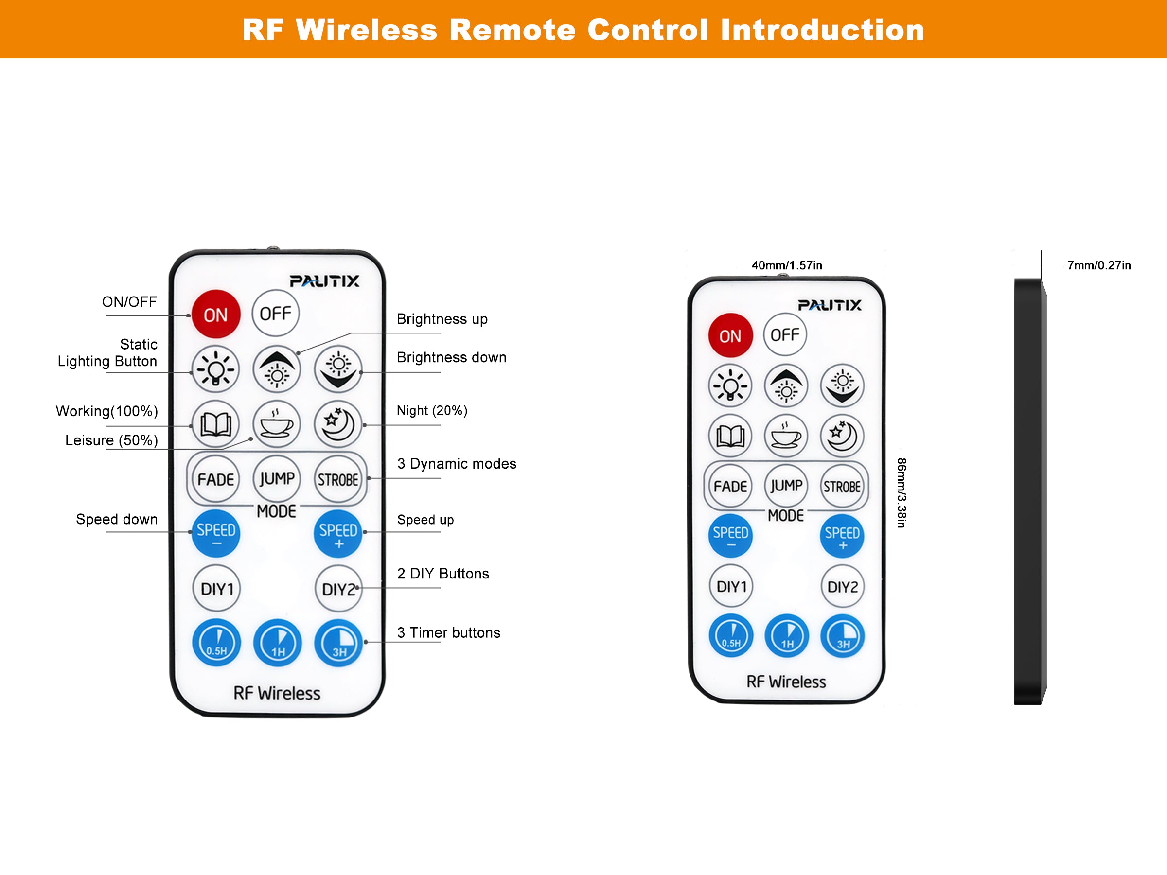 【Memory/Timer Function】The PAUTIX RF remote dimmer will keep the last time setting memory when you switch on the led lights again.With the timer function,you can set the time(0.5H/1H/3H) to delay the shutdown