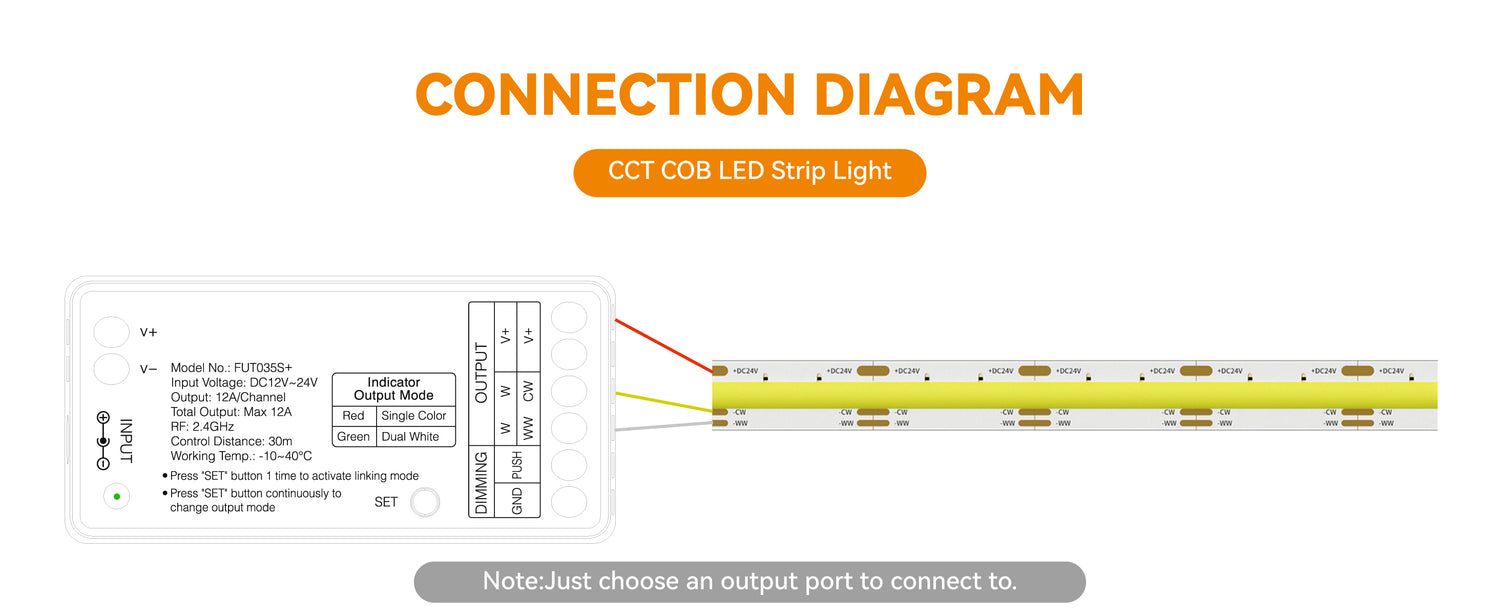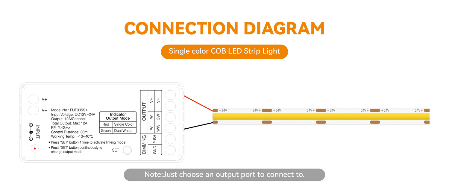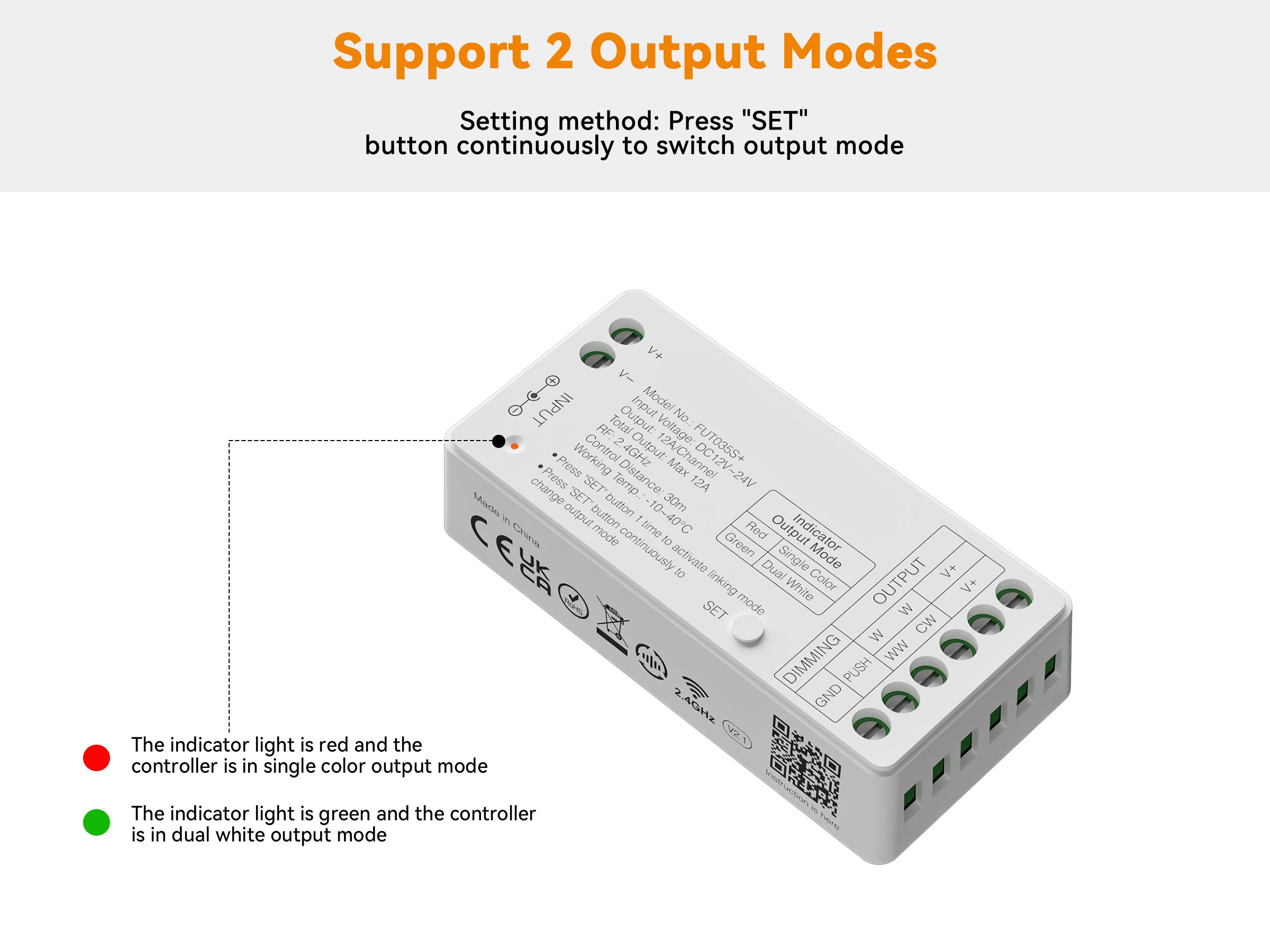 - SPECIFICATIONS:Input/Output Voltage: DC12-24V. Maximum output: 12A/channel (total maximum output 12A). Working temperature: -10℃~40℃. Communication Mode: RF 2.4GHz. RF remote control distance: 30 meters (99ft).