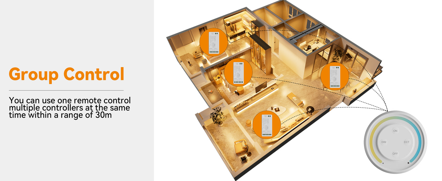 - AUTO-TRANSMITTING FUNCTION:One controller can transmit the signal of RF remote control to another/multiple controllers within 30 meters. For remote dimming only. Please make sure that the LED strips within 30 meters have a controller, and the remote control distance can be infinite. All controllers should be in the same group.