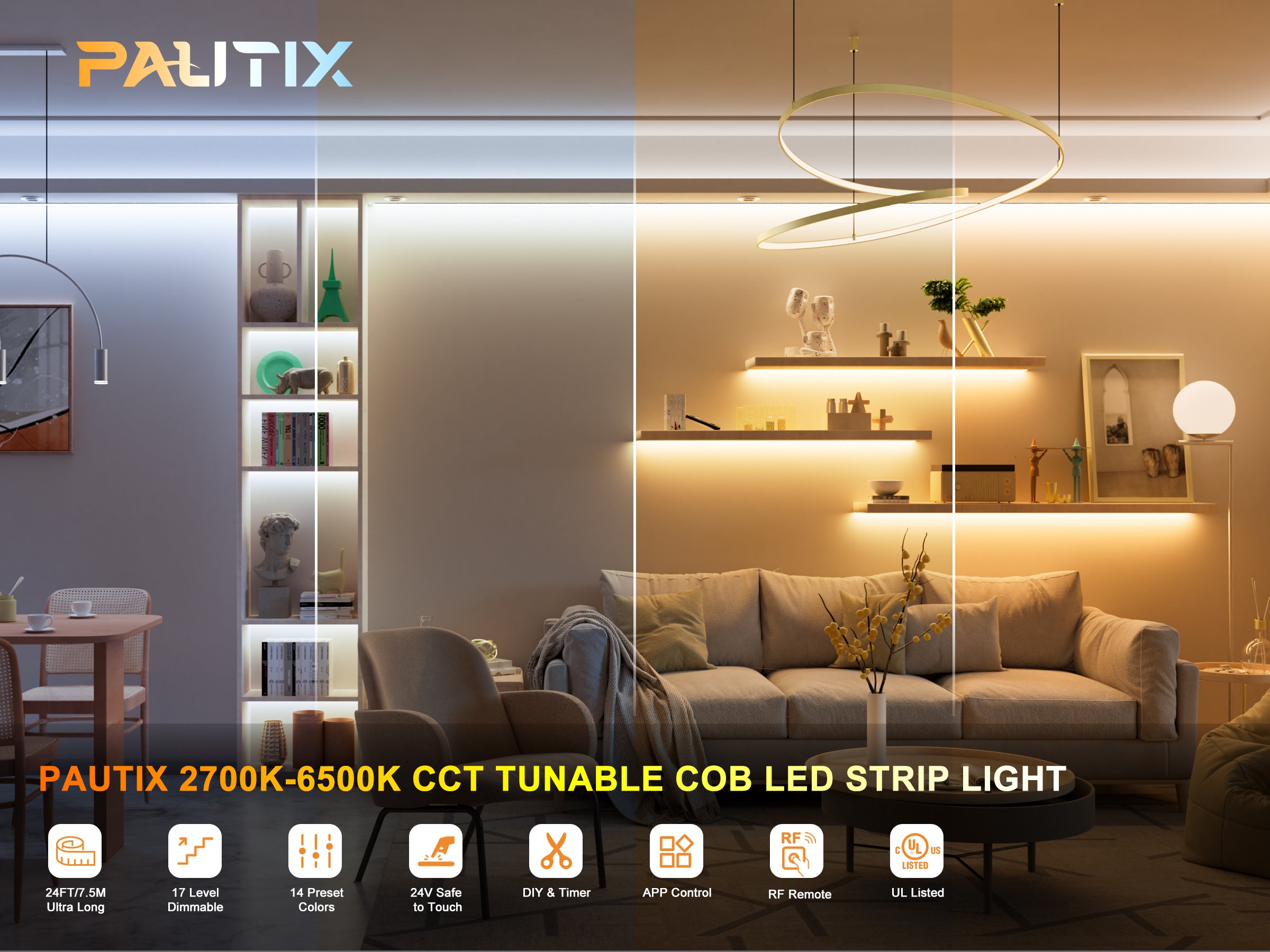 - 【Widely Use & Durable】PAUTIX Tunable COB LED Strip light is ideal for high-end business clubs,under cabinet,dressing mirror,make-up table,closet,bookshelf,wine shelf,TV backlight and other places need decoration. Real double-layer PCB and high-quality materials make PAUTIX COB led strip light durable,the lifespan is more than 65,000 hours. UL-listed, the quality is more trustworthy!