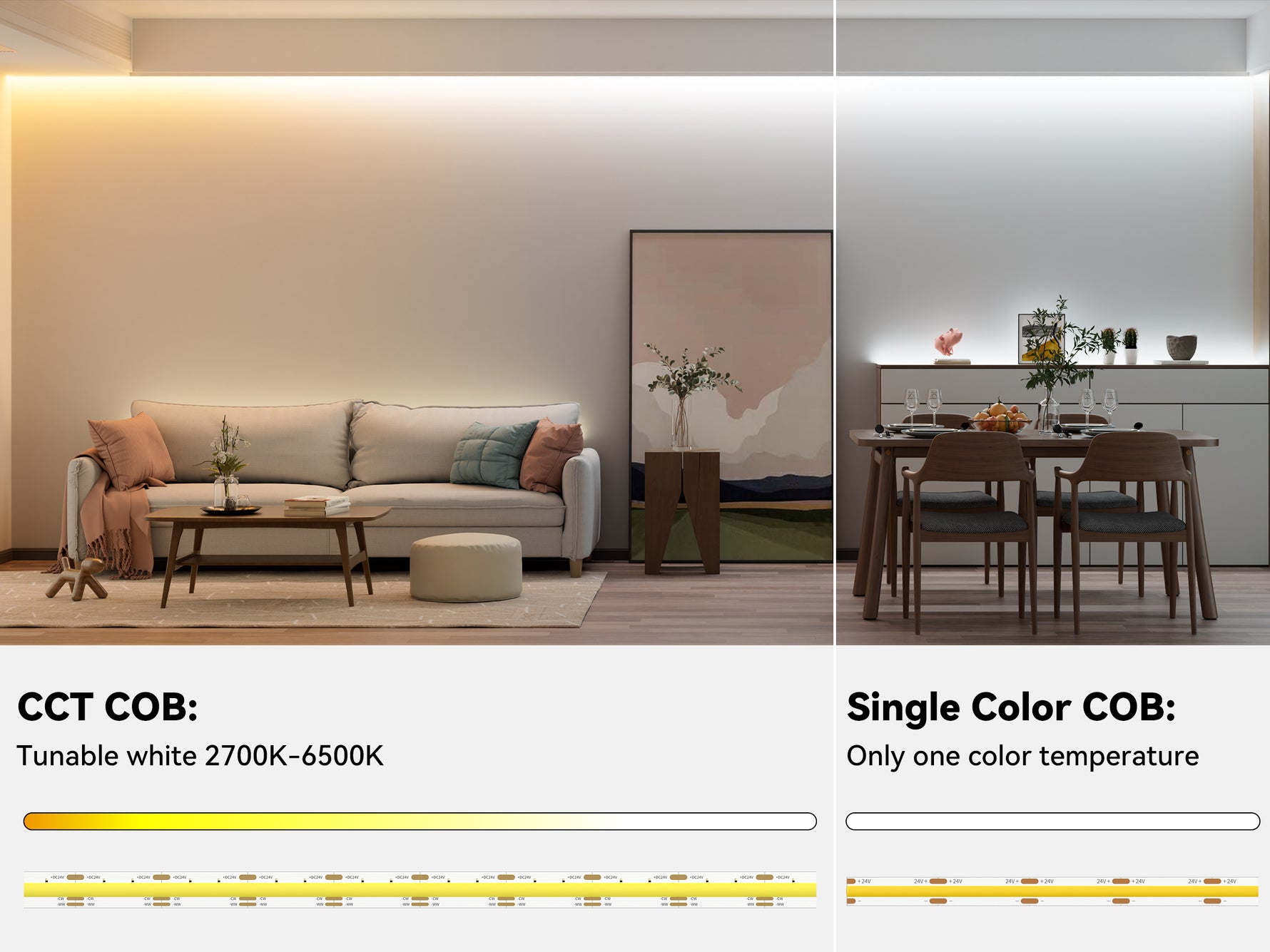 - 【Tunable White COB LED Strip Light】Dimmable white light from warm white to cool white (2700K-6500K),whether you are relaxing or working,one light to meet all your needs! You can choose the desired color temperature between 2700K and 6500K, such as 2700K/3000K/4000K/5000K/6000K/6500K, etc. With 4800LEDs,PAUTIX Tunable COB led strip light creates super bright and even lighting performance.Anti slip buckle design, connection is not easy to loose