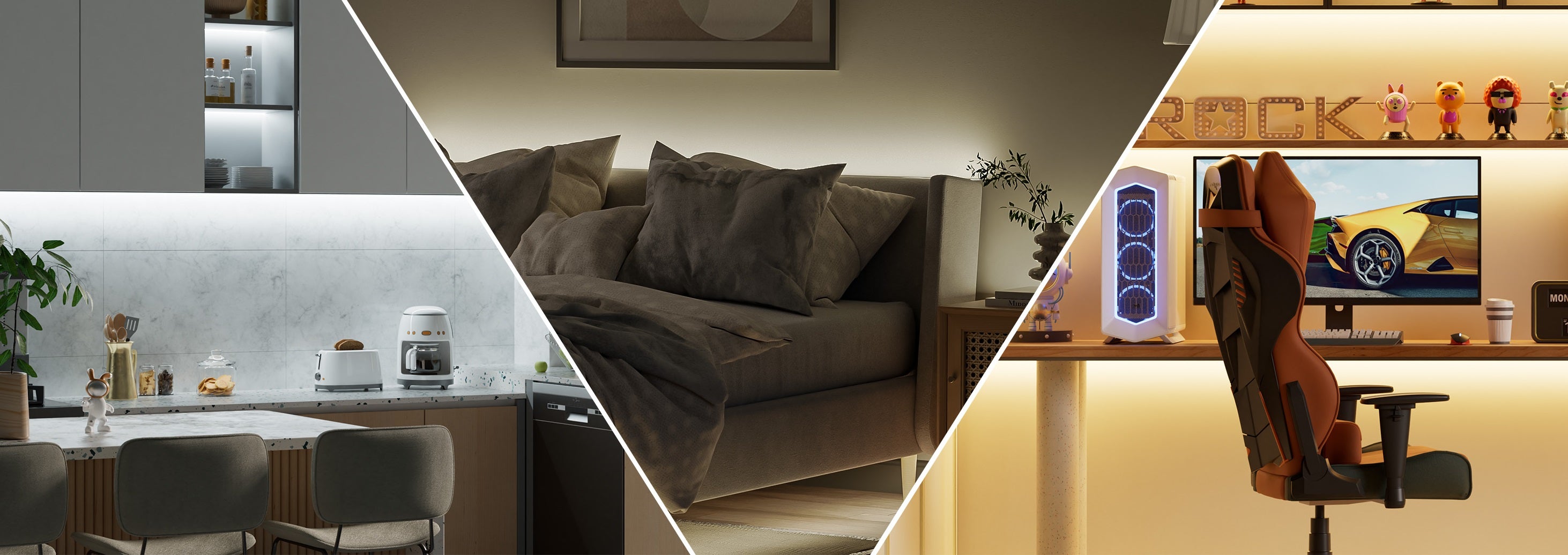- Three Control Methods: Support smartphone APP control, 2.4G remote control and one-button switch of the control box. You can choose any brightness and any color temperature between 2700K and 6500K through the APP. The remote control with built-in 17 brightness levels has 14 preset color temperatures, which can be switched at will by pressing the two buttons "Color Temperature±". The RF remote control means you can control your strip lights from any angle within 30m/99ft of an open area!
