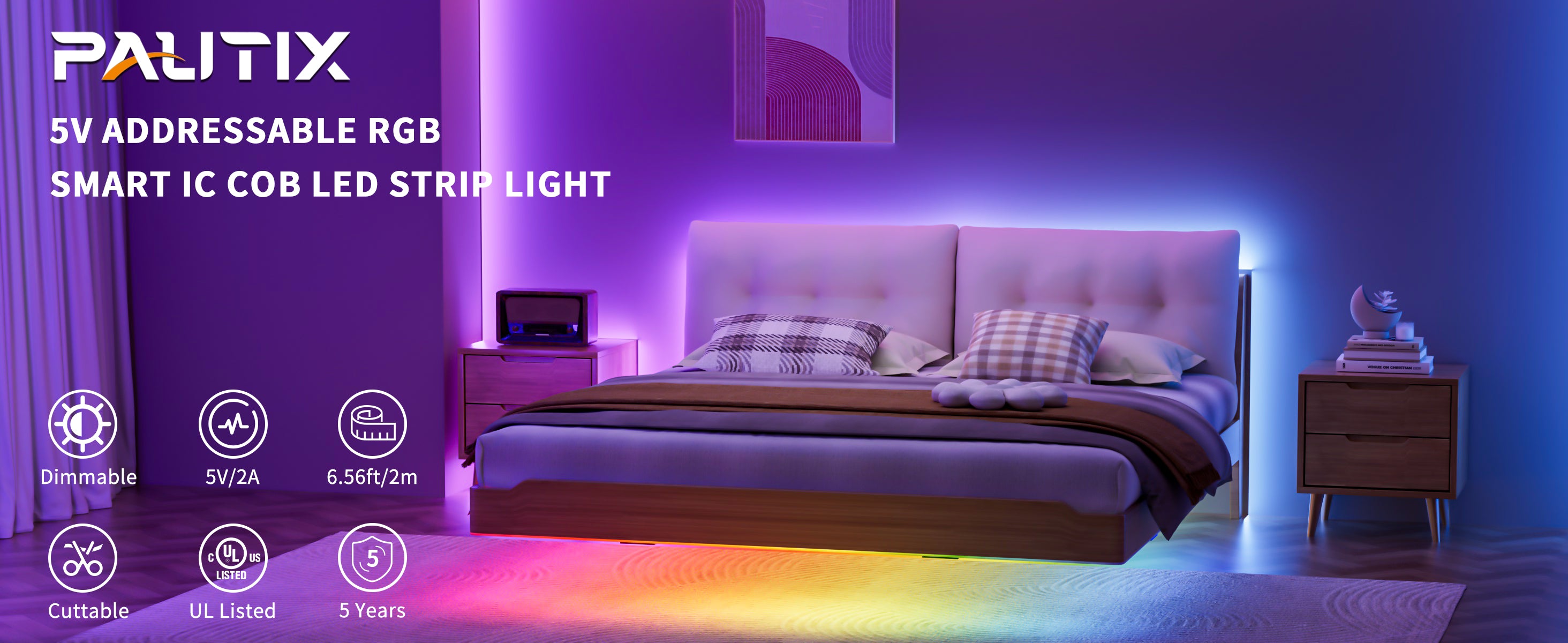 PAUTIX 5V USB RGB Smart IC COB LED Strip Light,6.56ft/2m