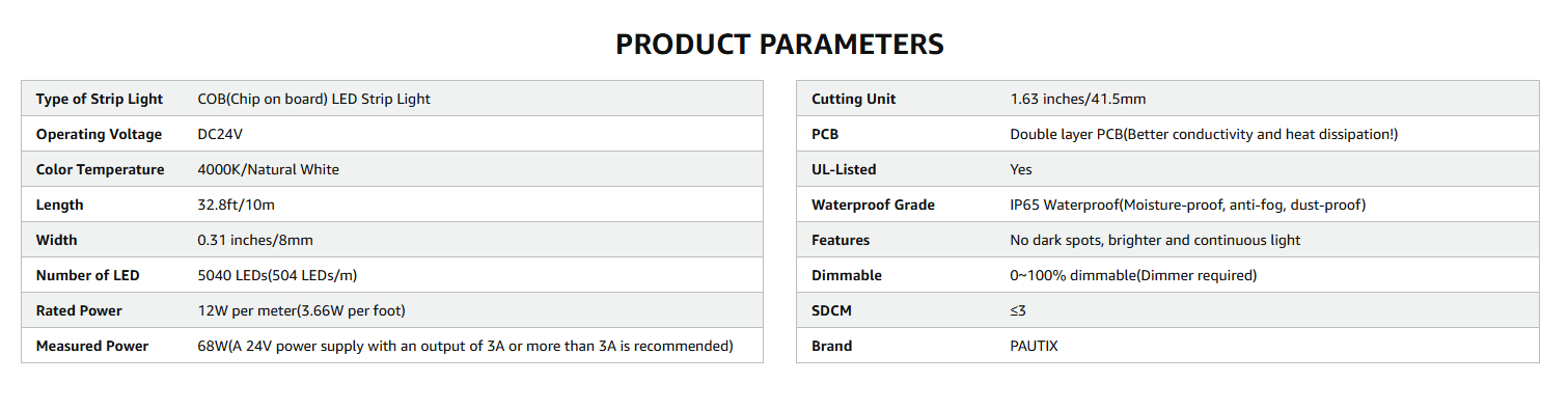- 【PACKAGING & CUSTOMER SERVICE】The package includes a 32.8ft/10m IP65 waterproof COB LED strip, a transparent gapless connector, a dual-end extension connector, and a clip. Please contact PAUTIX in time if you have any problems with the product or need help with installation, and PAUTIX will reply you within 24 hours and solve it for you!