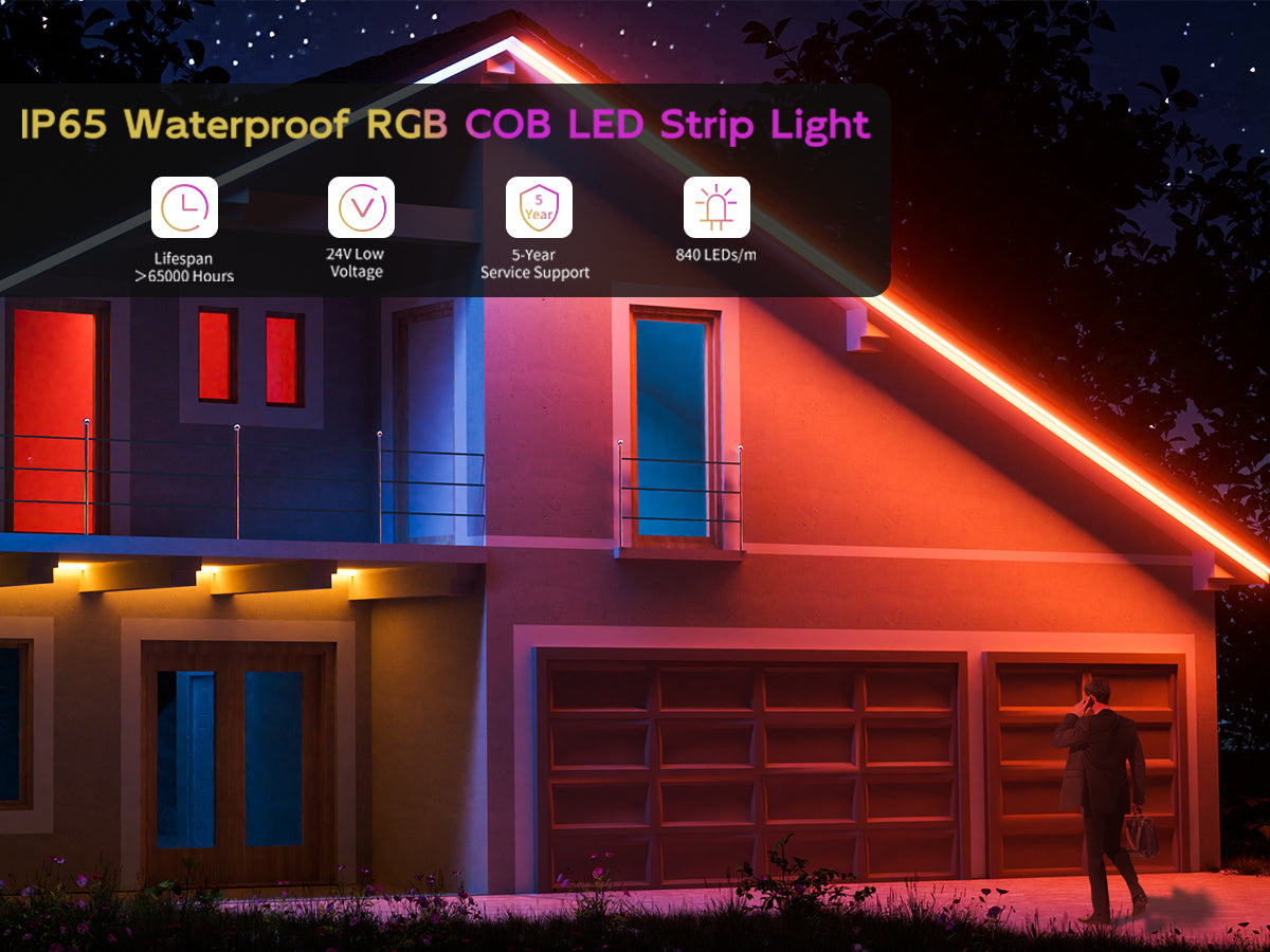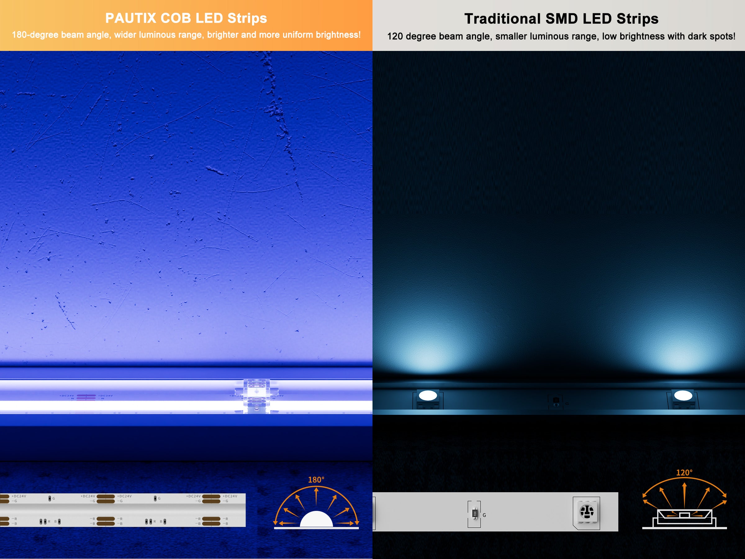 - 【Highlights of IP65 Waterproof】Different from the common PAUTIX RGB COB LED strips, the IP65 COB LED strips have a plastic sleeve added to the outer layer to protect the COB strips from splashing water. Ideal for installation in bathrooms or scenes with slight moisture.Without the dark spots of 2835,5050,5630 and other SMDs,the upgraded design of 4200 LEDs and a beam angle of 180 degrees makes the COB strip lighting performance smoother and more uniform
