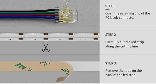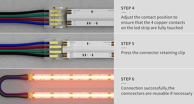 • 【Easy to Use】UPGRADED version kit,simple to install and no welding needed, this cob connector kit lets you DIY for a safe and easy job that will save you time and money.The advantage of the upgraded package is that it can be reset repeatedly and the installation is more convenient(The transparent connectors on the 4-pin wires are removable and used individually as connectors)