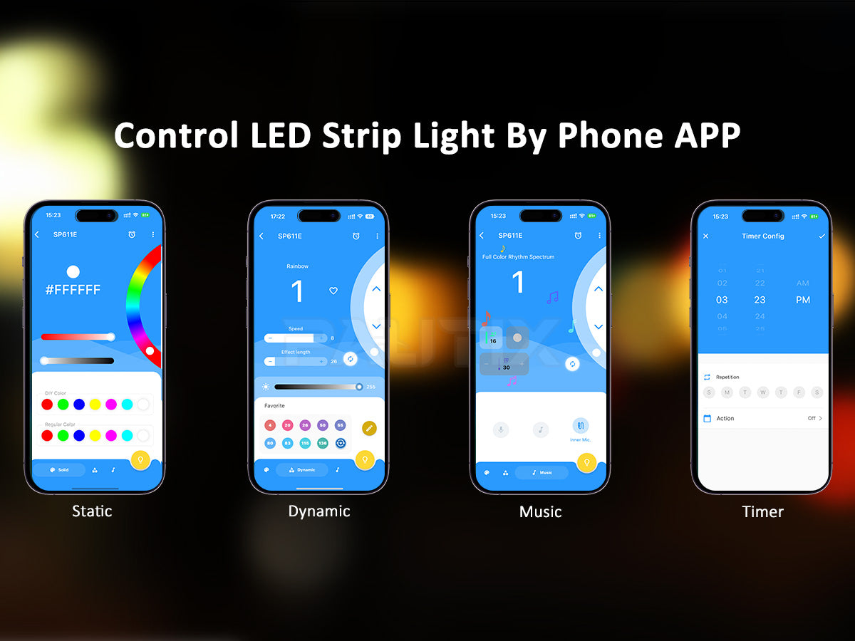 - Music Rhythm Synchronization:3 types of capture, phone microphone, player streaming, built-in microphone. Built-in high-sensitivity microphone that automatically adjusts the light and spectrum according to the ambient sound. There are 18 kinds of music effects for you to choose. Connect with smartphone app via Bluetooth(Please browse picture 2 or read the connection in the manual carefully)NOTE:Not suitable for RGB LED strip lights without smart IC