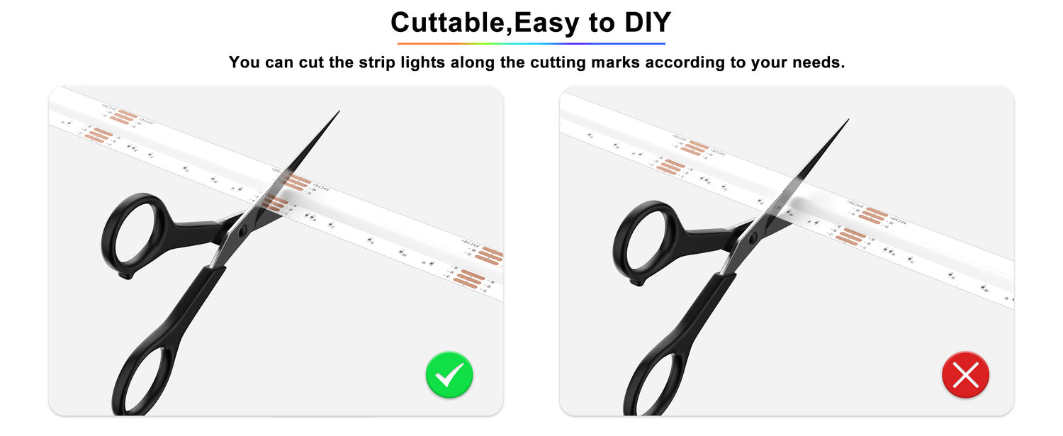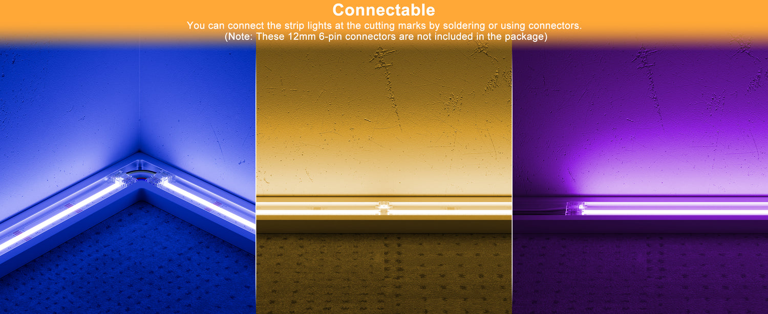 - Flexible,Easy to DIY: PAUTIX 24V RGB+CCT COB LED strip light designed in 12mm width & 6 electrical lines is very flexible. The strip light can be cut or reconnected every 42mm/1.65in along the cutting point. You can connect the strips by soldering or using connectors(Search for "B0CQY9N9M4" to find a compatible 12mm connector kit).