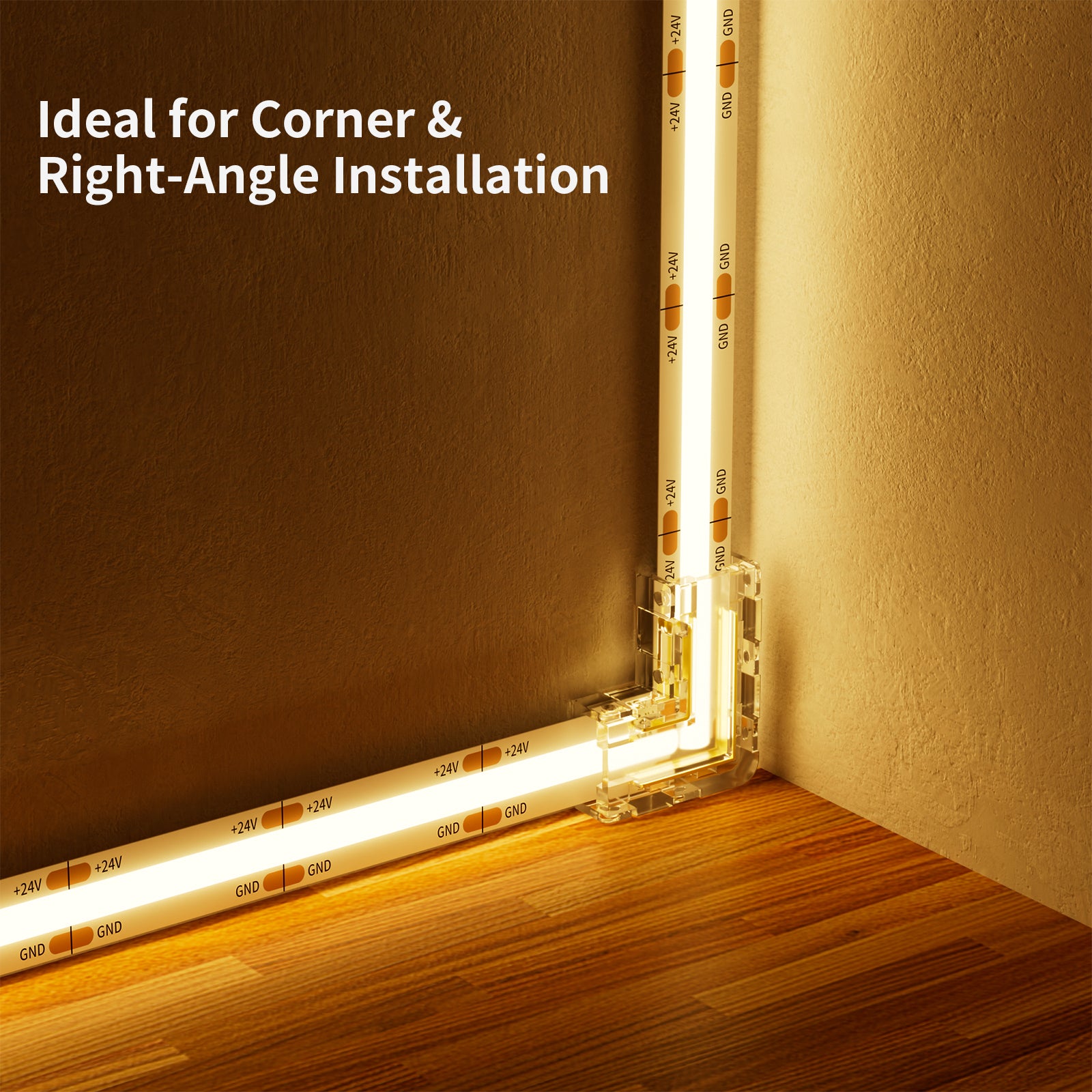 • 【Solderless & Gapless Connectors】Using this COB LED strip connector kit you can extend your strip light's length to be longer, eliminating the issue of limited space. These accessories let you extend and connect light strips, the straight connectors(L-Shaped) in the kit let you achieve a corner connection