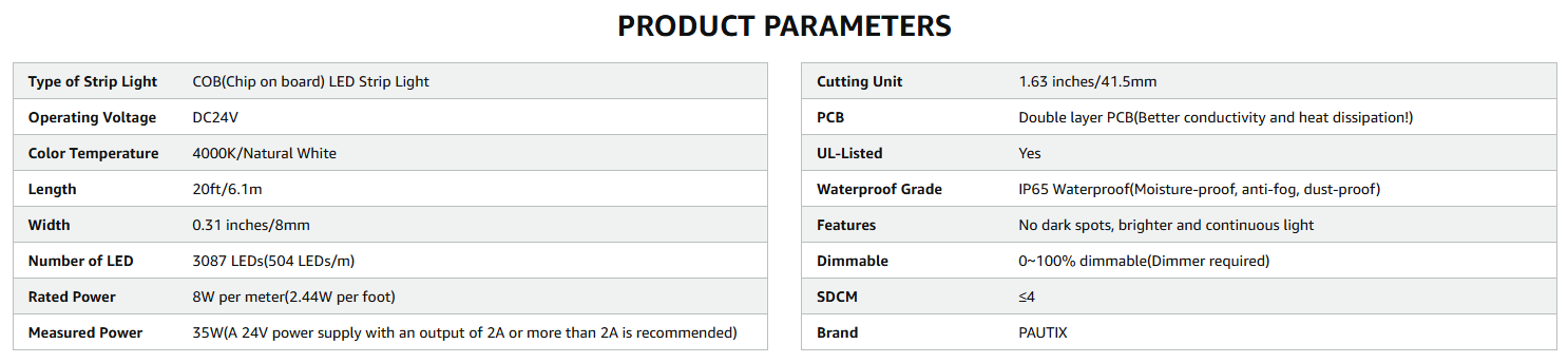 - 【LONGER & BRIGHTER】PAUTIX COB LED strip lights with 504 LEDs per meter and 100 lumon/W are Brighter than other COB strip lights.And the length 20ft/6.1m makes the COB strip light to reach and bright further places.IP65 waterproof natural white 4000K COB LED strip light provides soft linear lighting for your life.With 24V voltage,the 20ft COB LED strip light has better lighting effects than traditional 12V voltage(Adapted 24V/36W)(Power interface specification: 5.5mm 2.1mm)