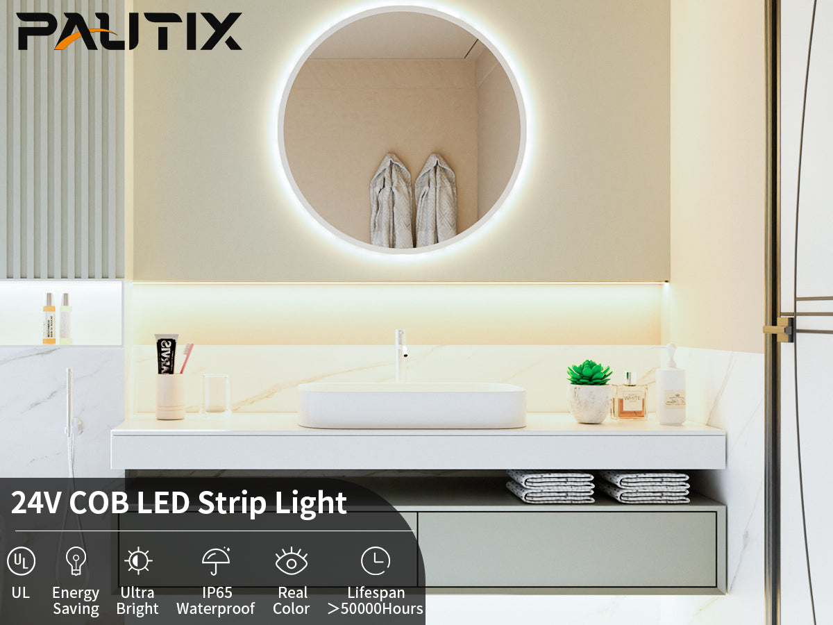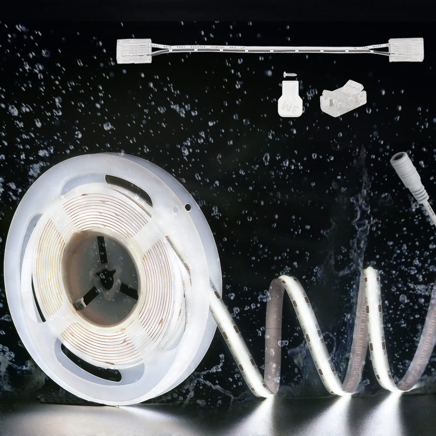 - 【HIGHLIGHTS OF IP65 WATERPROOF COB STRIPS】Different from the common PAUTIX COB LED strips, the IP65 COB LED strips have a plastic sleeve added to the outer layer to protect the COB strips from splashing water. Ideal for installation in bathrooms or scenes with slight moisture.Without the dark spots of 2835,5050,5630 and other SMDs,the upgraded design of 504 LEDs per meter and a beam angle of 180 degrees makes the COB strip lighting performance smoother and more uniform