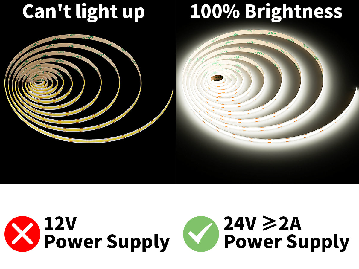 - 【COMPATIBLE ACCESSORIES】It can be dimmed with a single color dimmer, search for "PAUTIX RF dimmer for single color led light" to find the matching dimmer. Compatible with most Wi-Fi dimmers, Bluetooth controllers, RF remotes or IR controllers, etc. Compatible with 24V 2A or higher power supply (1.83-2.13 watts increase in rated power for each additional foot of strip length). Note:This COB strip light does not include power adapter and remote control