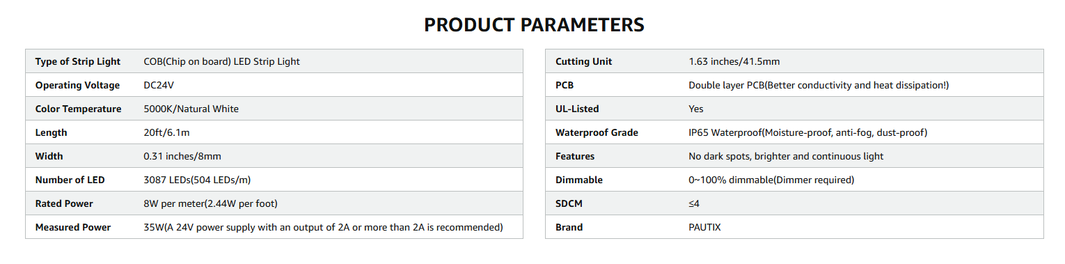 - 【UL-LISTED,SAFER TO USE】With nice heat dissipation effect(PCB double-layer thick copper) and UL-listed,the performance of the PAUTIX COB LED strip lights are more stable and safer to use for daily lighting.High-quality PCB double-layer thick copper consumables make it sturdy,with a service life of over 65,000 hours.And the high CRI(CRI 90+) makes the color reproduction more realistic