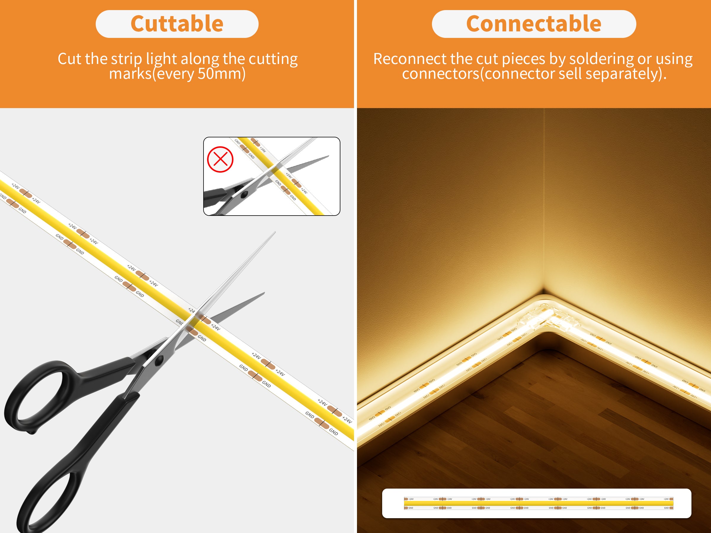 • Easy to DIY: PAUTIX COB LED strip lights are very flexible and they can even be bent. They are cuttable and connectable. The middle of the metal point on the strip light is a cutting mark (one cutting unit every 50mm/1.97 inches), and the cut strip light can also be reconnected, which is very convenient for DIY! The strip light is 8mm (0.32 inches) wide, allowing you to fit it into very tight places!
